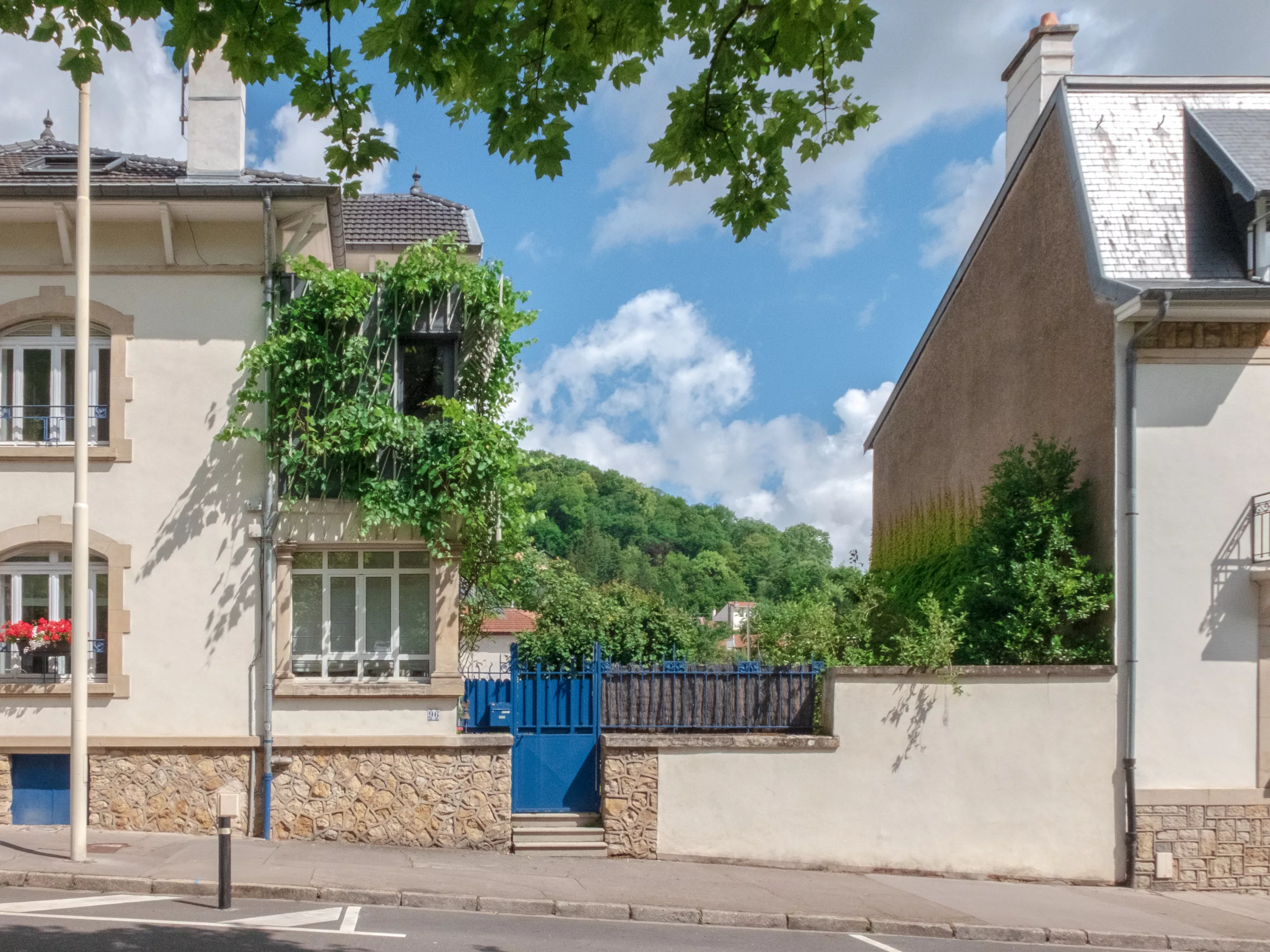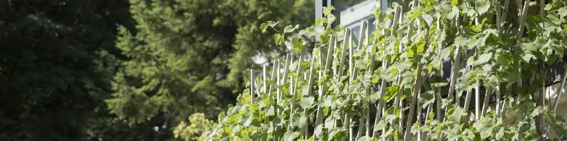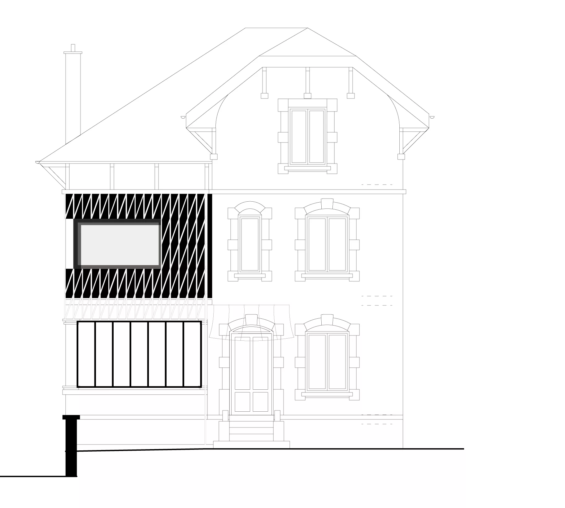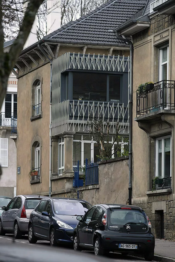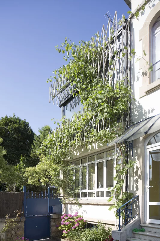 Reconstruction d’une extension délabrée à l’étage d’une maison de ville. Le parement, conçu tel un treillage, enrichit la volumétrie et la vie du projet au fil des saisons