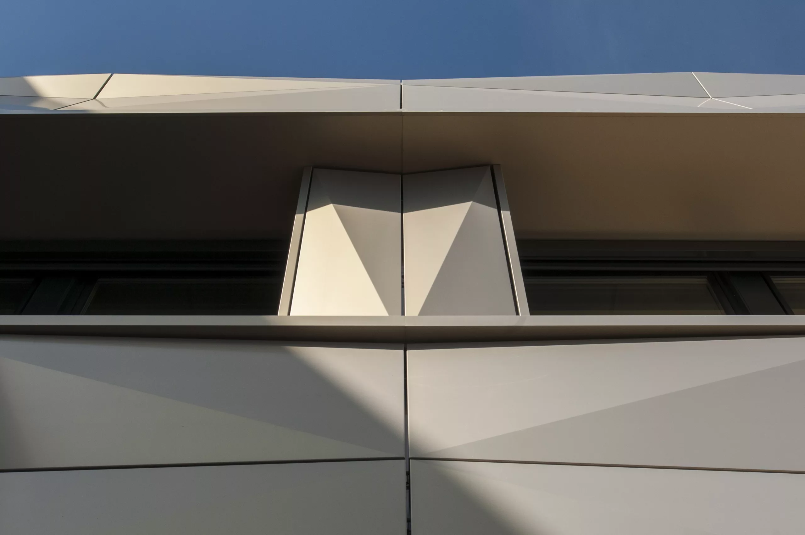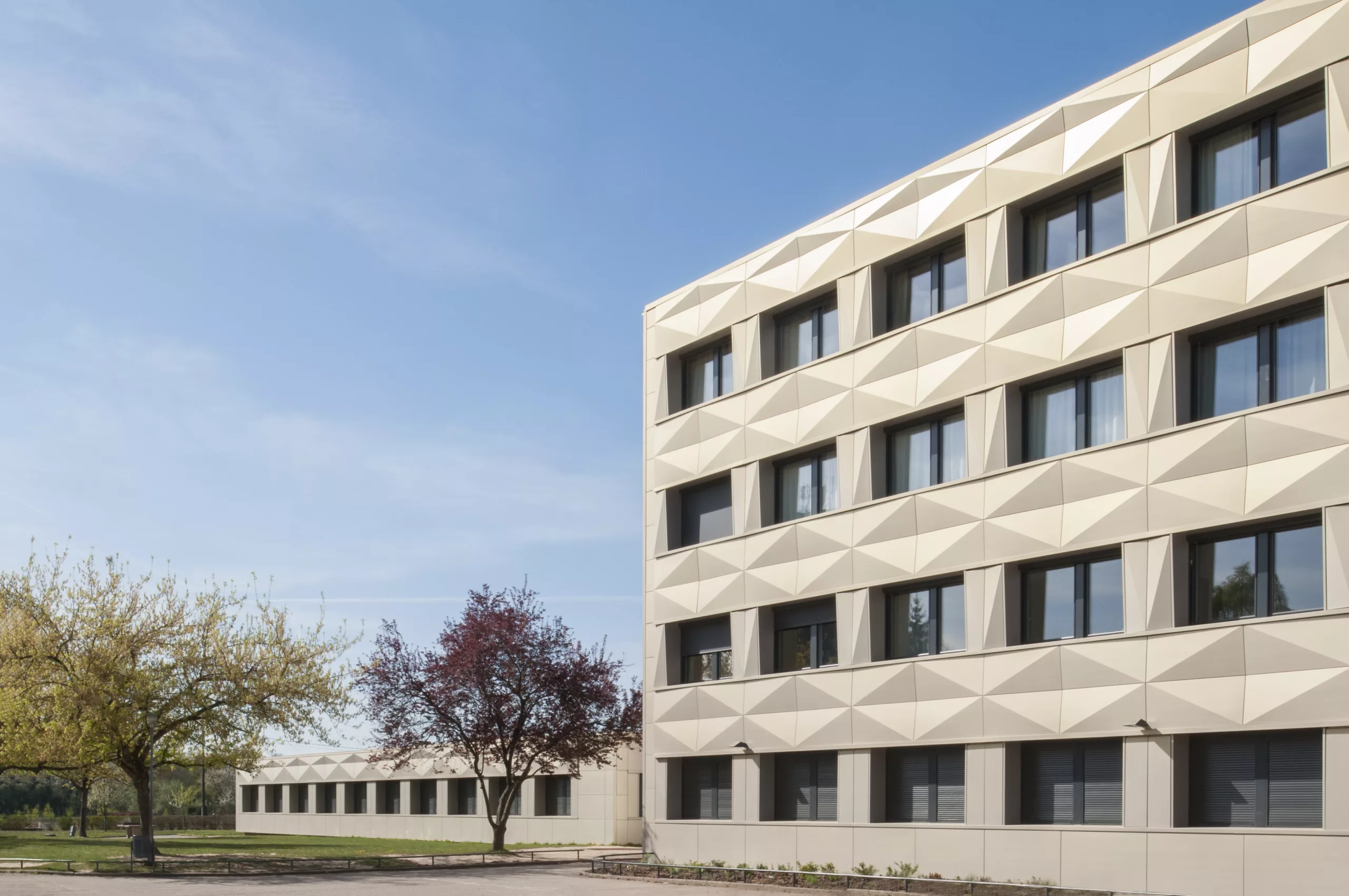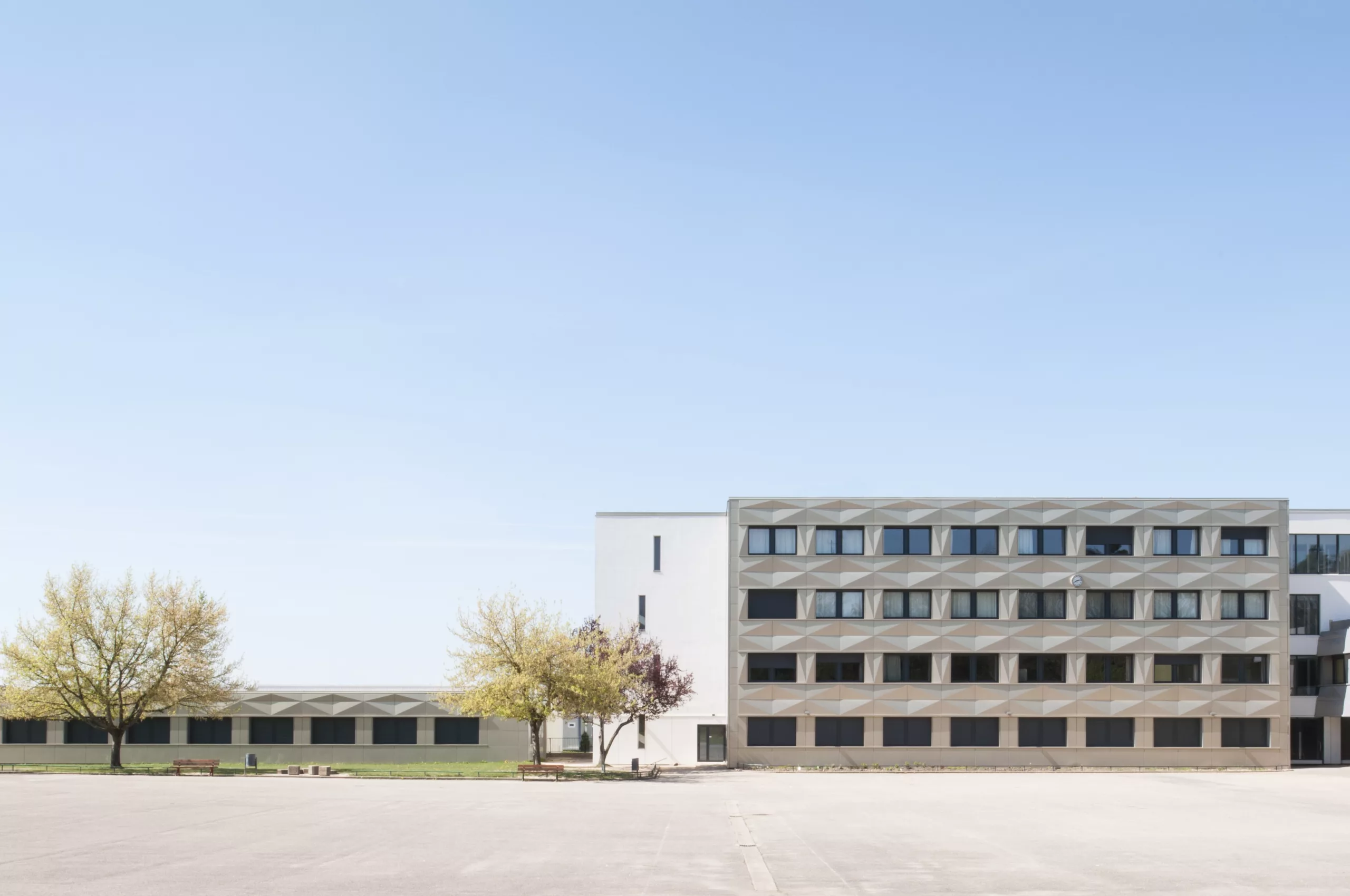 Restructuration partielle du collège avec réorganisation des différents pôles : hall, vie scolaire, demi-pension et SEGPA. La nouvelle isolation extérieure est protégée par une vêture métallique dont le pliage en pointe de diamant réinterprète celui des panneaux béton d’origine