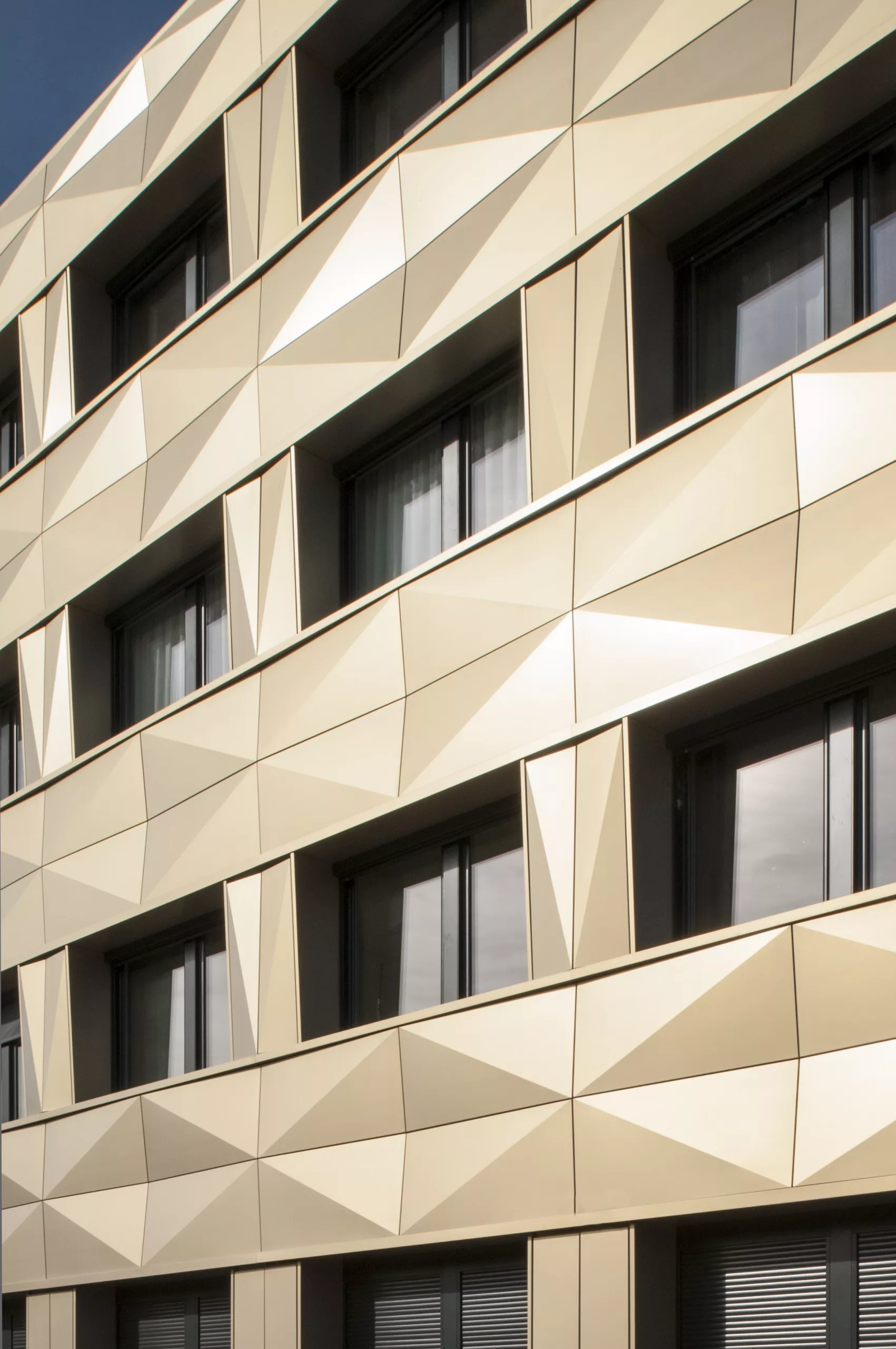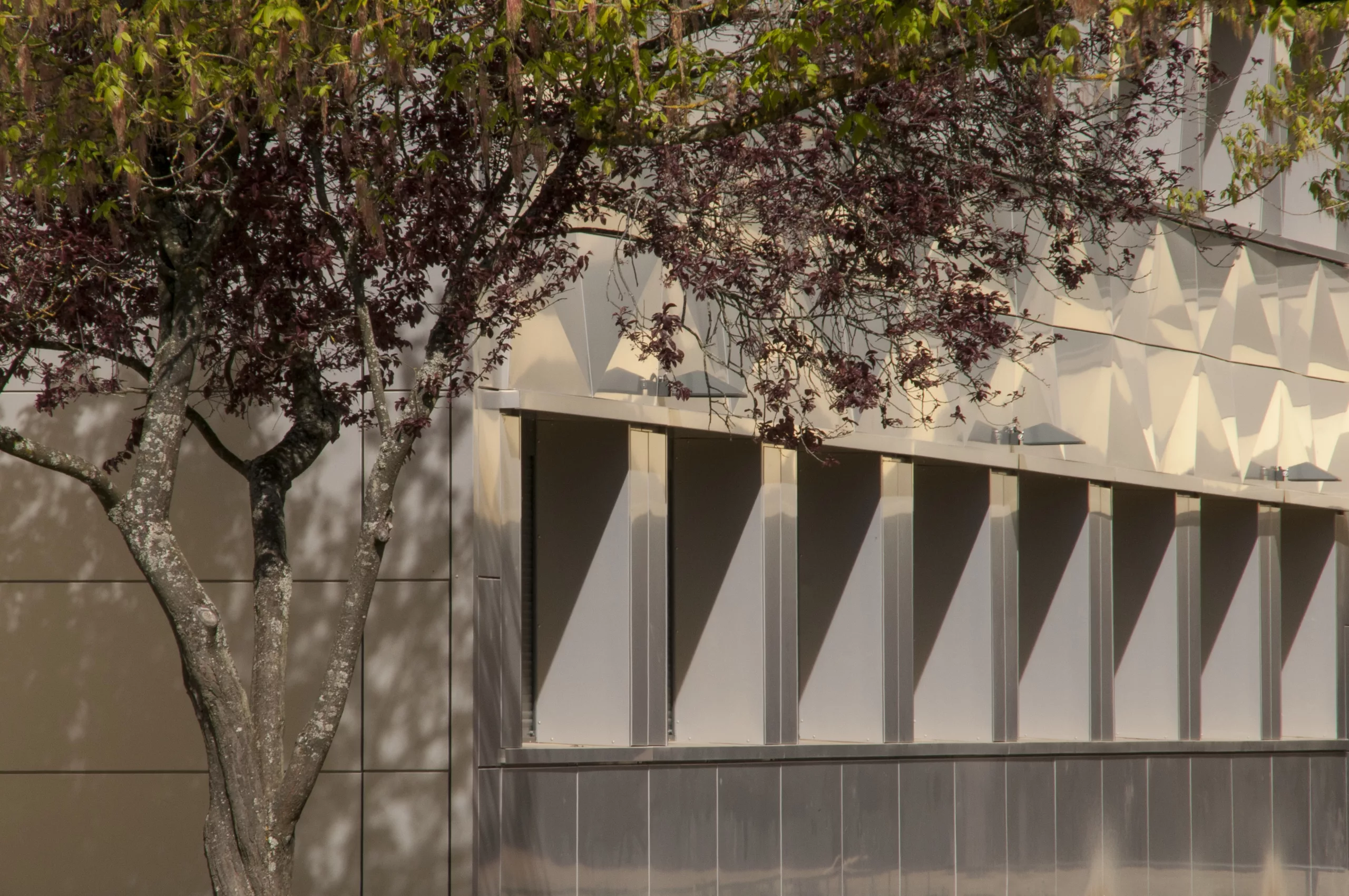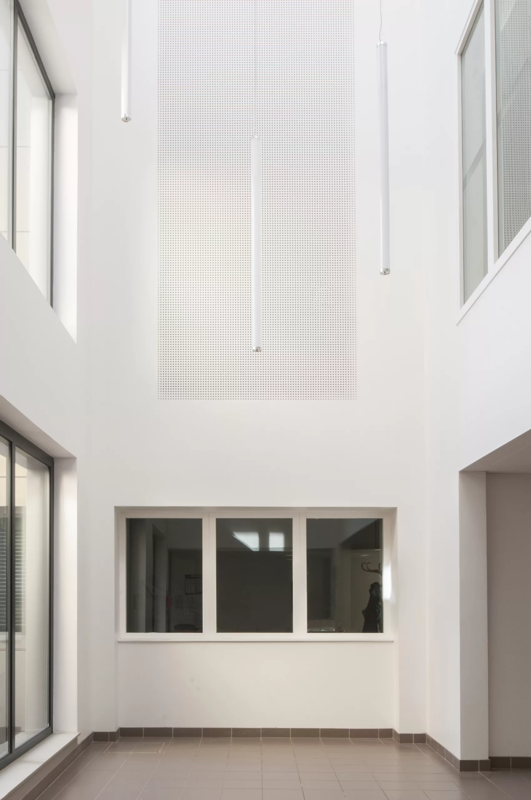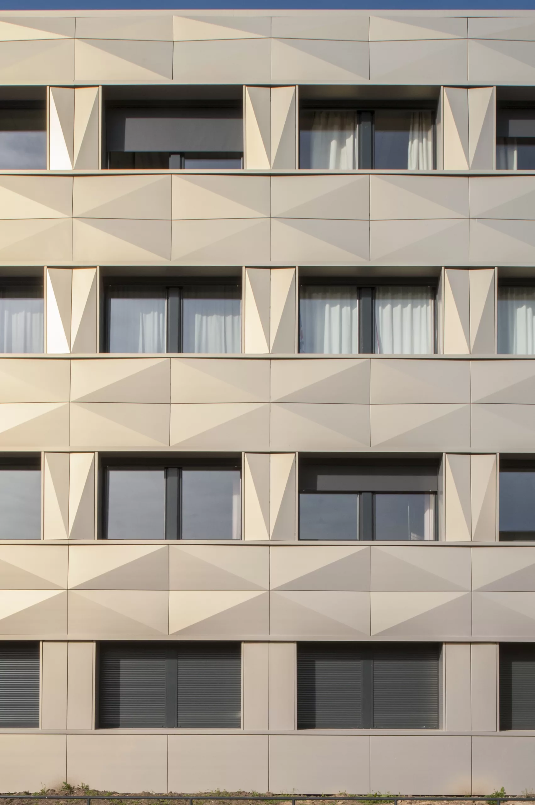Restructuration partielle du collège avec réorganisation des différents pôles : hall, vie scolaire, demi-pension et SEGPA. La nouvelle isolation extérieure est protégée par une vêture métallique dont le pliage en pointe de diamant réinterprète celui des panneaux béton d’origine
