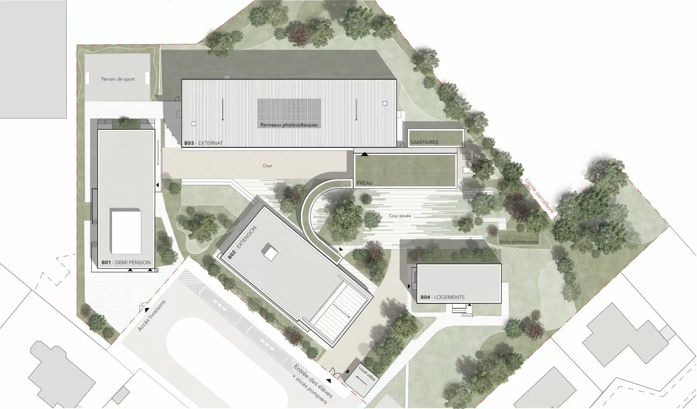Restructuration des bâtiments existants, construction d’un préau et d’un bloc sanitaires, aménagement d’une cour paysagère